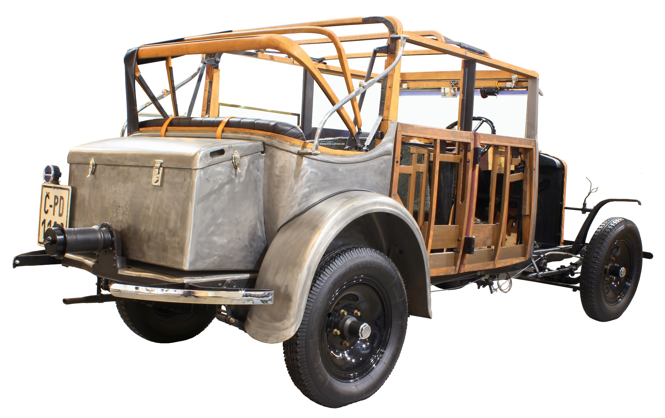 An diesem teilweise restaurierten Skoda 430 von 1932 kann man sehr gut die Bauweise damaliger Autos und Karosserien betrachten. Das Chassis (Fahrgestell) ist ein tragender Leiterrahmen. Vorne und hinten sind Starrachsen mit Trommelbremsen montiert. Für den Aufbau gab es verschiedene Karosserievarianten: Limousine, Tourenwagen, Phaeton, Roadster, Cabriolet oder Landaulet. In den insgesamt 5 Fotos von diesem Fahrzeug erkennt man die Holzkonstruktion der Karosserie, die mit Blech beplankt wird. Der Karosseriebauer der damaligen Zeit musste also sowohl Holz als auch Metall bearbeiten können. Auf zwei der fünf Fotos ist auch der innere Aufbau der Sitze (die Polsterung) gut zu sehen.