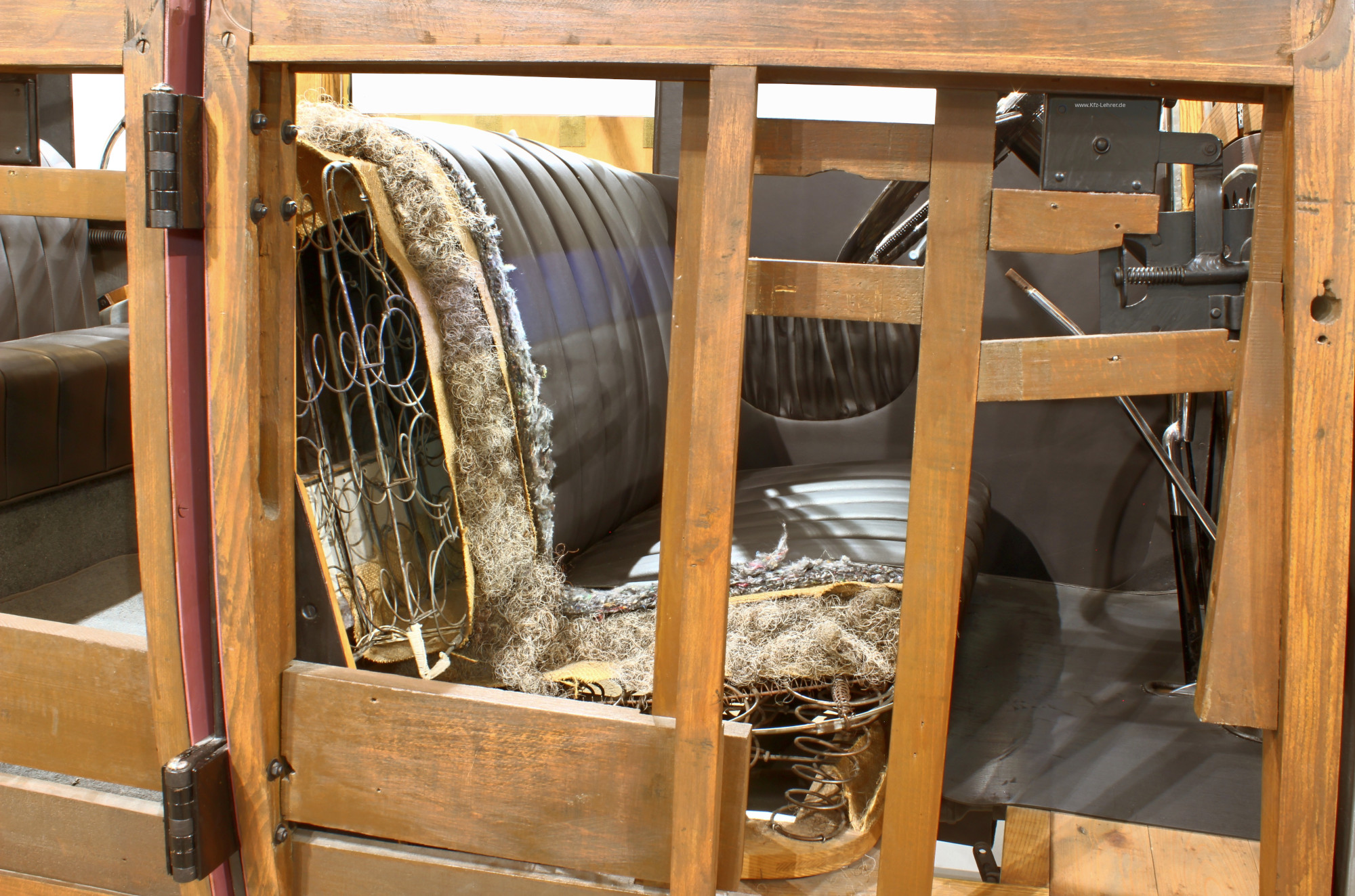 Fotografiert wurde die nur zum Teil restaurierte Sitzbank, so dass die inneren Federn und Stoffe sichtbar werden.